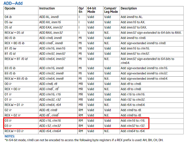 As we saw in our first example (at the start of the article), when a multi-byte int 3 occurs, the _EXCEPTION_RECORD.ExceptionAddress and _CONTEXT.Rip values will lie in the middle of our multi-byte instruction instead of at the start. This means that the debugger will incorrectly determine that the instruction which threw the software breakpoint begins with the opcode 0x03. Referring to the trusty Intel manual, we can see that this opcode represents a 2-byte add instruction: